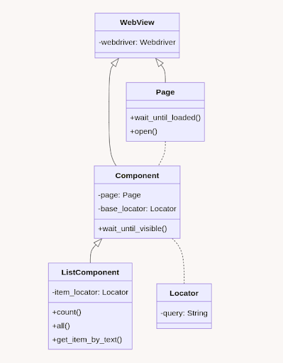 To identify elements on the page, we developed a wrapper class named Locator for the locators provided by the Selenium XPath. We created the Locator wrapper class to avoid having to specify the locator strategy used each time and to reduce the amount of raw XPath used. Some autotest guides recommend avoiding XPath (ie: Playwright). However, we found it is more flexible since it allows us to easily create nested locators (for this, we implemented the “/” and “//” operators). This is especially useful when the page contains a component with a list of complex subcomponents.